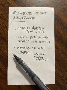 I also believe there are psychological elements behind some of these problems, which in my own thinking I collectively term “The Resistance.” (An adaptation of Steven Pressfield’s thinking.) Thinking about these sometimes allows me to better understand behavior of people in a democracy.