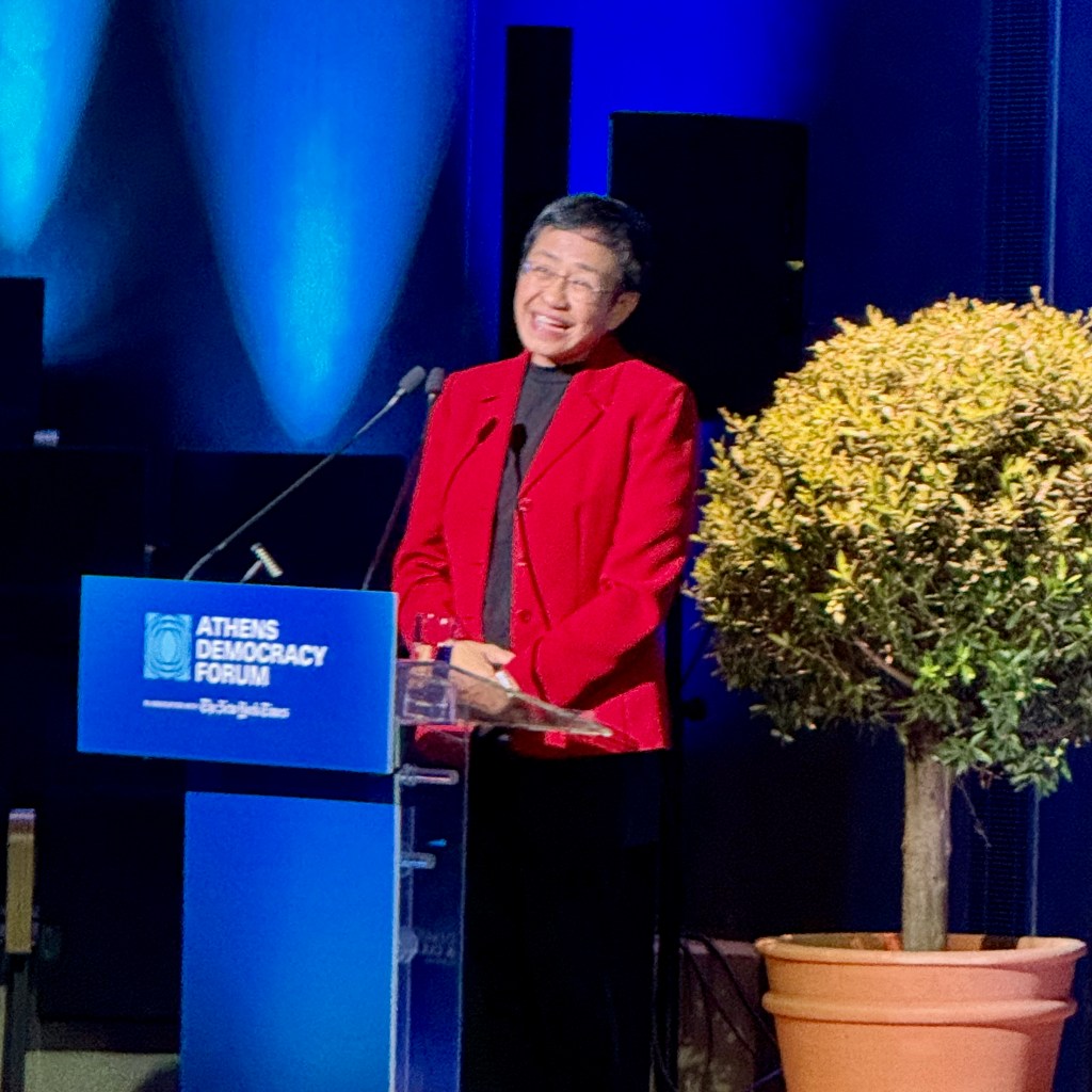 At the Athens Democracy Forum, Nobel Peace Prize winner Maria Ressa gave the Aristotle Lecture. She warned of the rise of impunity. Seventy-two percent of the world’s population now lives under authoritarian rule.