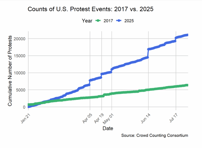 These rallies are not small. Political scientist Erica Chenoweth and her Crowd Counting Consortium at Harvard have tracked participation in democracy-related protests throughout the year. Their data show that more Americans have demonstrated in 2025 than at the same point in Trump’s first term.